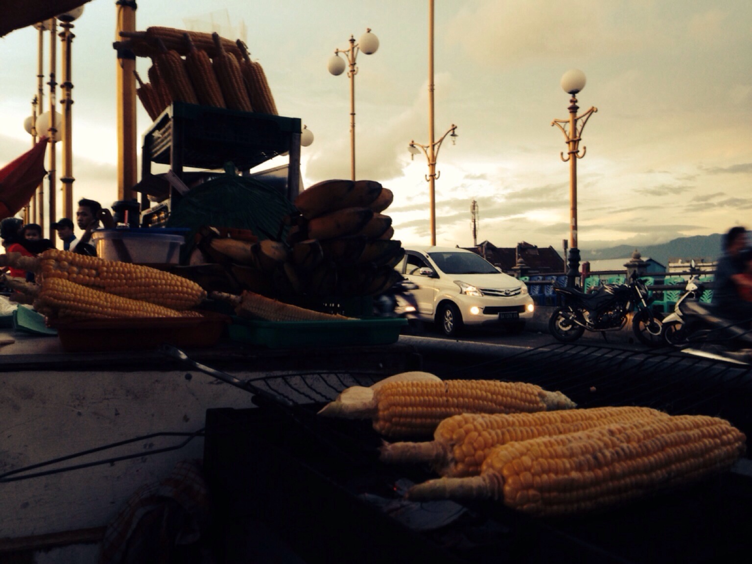 Jembatan Siti Nurbaya adalah jembatan yang terbentang dari pusat kota Padang ke arah gunung Padang. Konon di atas gunung Padang itu terdapat makam Siti Nurbaya, legenda korban kawin paksa di ranah Minang yang sangat terkenal. Karena sore itu adalah hari Jumat sore, dan masih suasana liburan, jembatan terlihat sangat ramai oleh orang-orang yang nongkrong di sepanjang jembatan. Kiri kanan jembatan penuh dengan penjual pisang bakar, jagung bakar, sate Padang, dll. Mobil-mobil yang parkir sepanjang sisi jembatan membuat kemacetan mengular panjang. Tapi hal itu gak mengurangi keasyikan gue menikmati sore itu (termasuk menikmati jagung bakar, pisang bakar, dan sate padang). Pemandangan matahari terbenam di ujung sungai rasanya sungguh mengobati kelelahan hari itu.