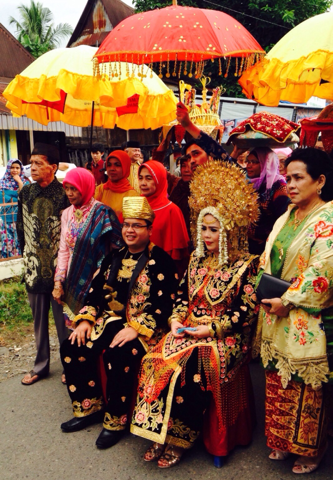 Di adat mana aja, kawinan itu pasti rempong yekaaan. Nah begitu juga di sini. Rencana acara jam 12 siang, penganten datang jam…..5 sore. Gue sih telat jadi cuma nunggu 4 jam, tapi temen-temen gue ada yang nunggu sejak jam 9 pagi lho (ikut prihatin ya kamiki, katiti, Bang Topan). Dan mereka dihibur dengan musik di atas panggung yang memainkan lagu-lagu 70an dan lagu daerah Minang. Tapi entah siapa yang nyusun song list, dari awal kebanyakan lagu-lagu sedih tentang perpisahan dan patah hati (Bani, I think you should ask your money back for this group band mendayu-dayu).