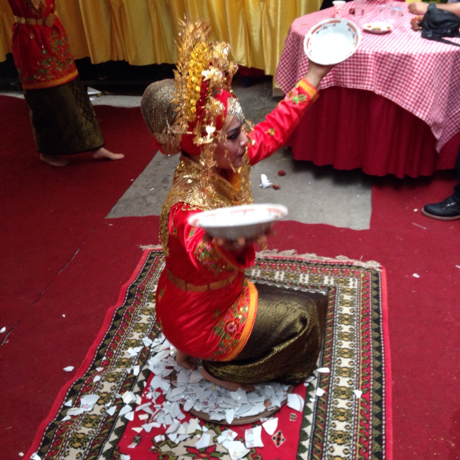 Di sini ada yang menarik lagi. Untuk anggota rombongan (keluarga), makan di dalam dengan duduk di tikar dan makanan disajikan di tengah. Untuk tamu-tamu lain, makanan disajikan secara prasmanan di meja di luar rumah. Gue ngintip ke dalam, dan ada satu menu yang ada di dalam tapi gak ada di luar. Kepala ikan. Rasanya pengen ngaku-ngaku jadi keluarga deh biar bisa duduk di dalam hahahaha. Acara masih tetap ada. Di luar rumah, penari-penari tadi masih menyuguhkan tari-tarian khas Minang. Dan kejutan berikutnya kembali muncul saat penari menampilkan tari piring. Sebelumnya di depan rombongan penari sudah diletakkan pecahan-pecahan piring (yang mungkin berasal dari piring-piring yang jatuh oleh penari pemula :p) di atas alas kain. Jadi di akhir tarian, satu penari maju ke depan, berdiri di atas pecahan piring itu, lalu meloncat-loncat sampai pecahan piring itu makin remuk. Gue nahan napas, takut aja kalo kakinya kegores pecahan piring. Tapi ternyata si uni penari baik-baik aja tuh. She’s the expert I think. Lalu acara selesai? What do you think? Ya nggak lah. Kami masih makan (lagi), lalu masuk ke dalam untuk foto-foto dengan penganten, baru pulang.