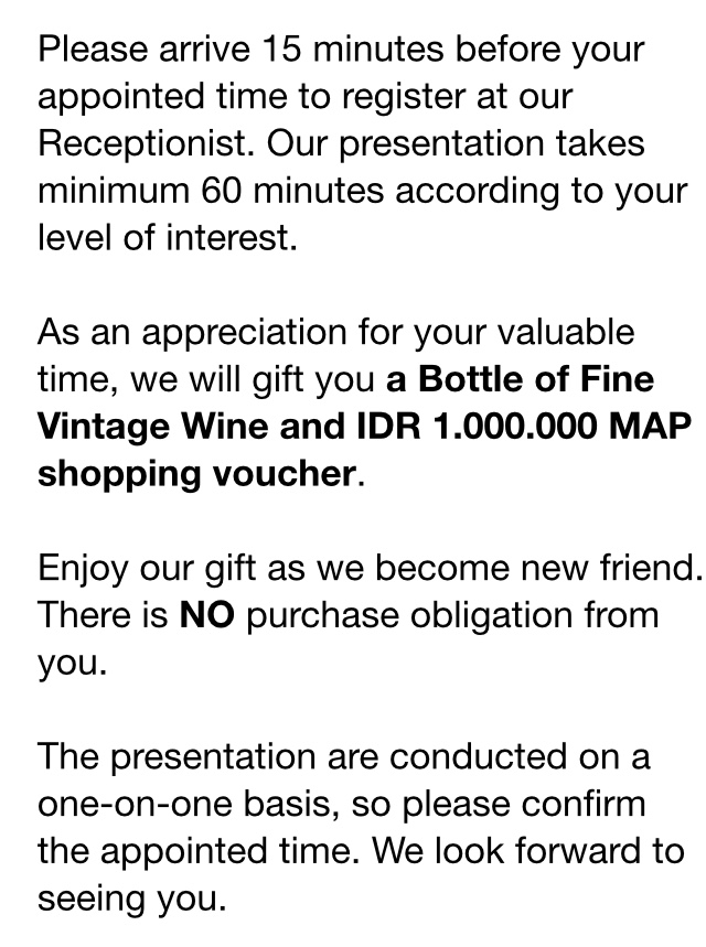 Gue tetep nolak karena butuh waktu buat mikir dan cari tahu tentang wine investment ini di internet atau tanya-tanya temen dulu. Maklum, lagi rame investasi bodong, jadi meskipun gak terlalu besar jumlah uangnya tapi tetep aja gue harus yakin dulu. Eh si bule langsung ngomong ke sales local “Sorry that you don’t get new client today. Just give him the wine and voucher because that’s why he came here”, sambil dia ngambil lagi kartu namanya yang tadi dikasi ke gue, trus dia pergi ke ruangannya.