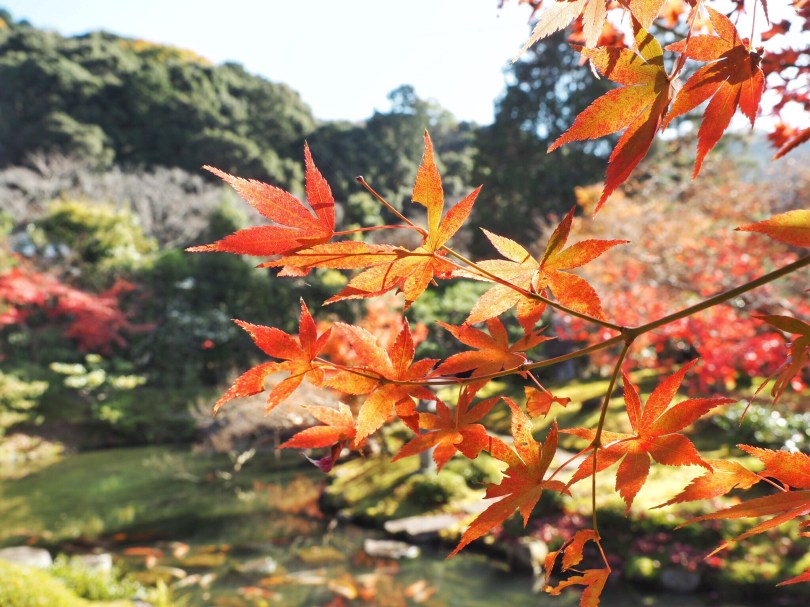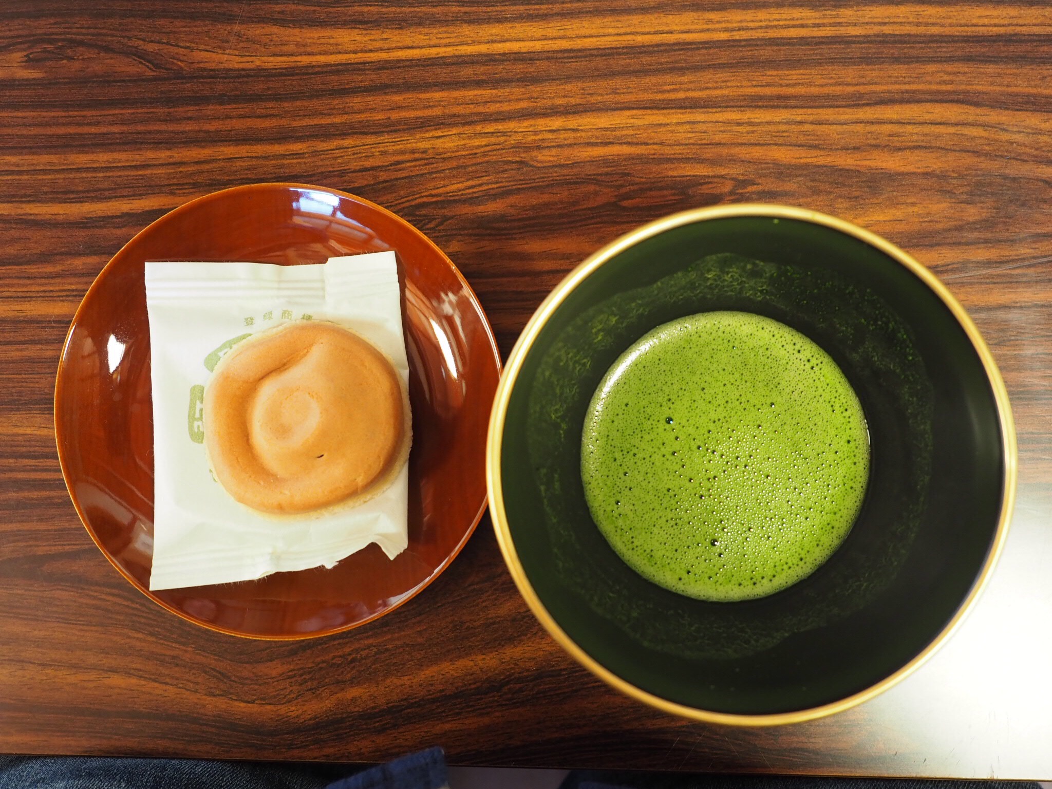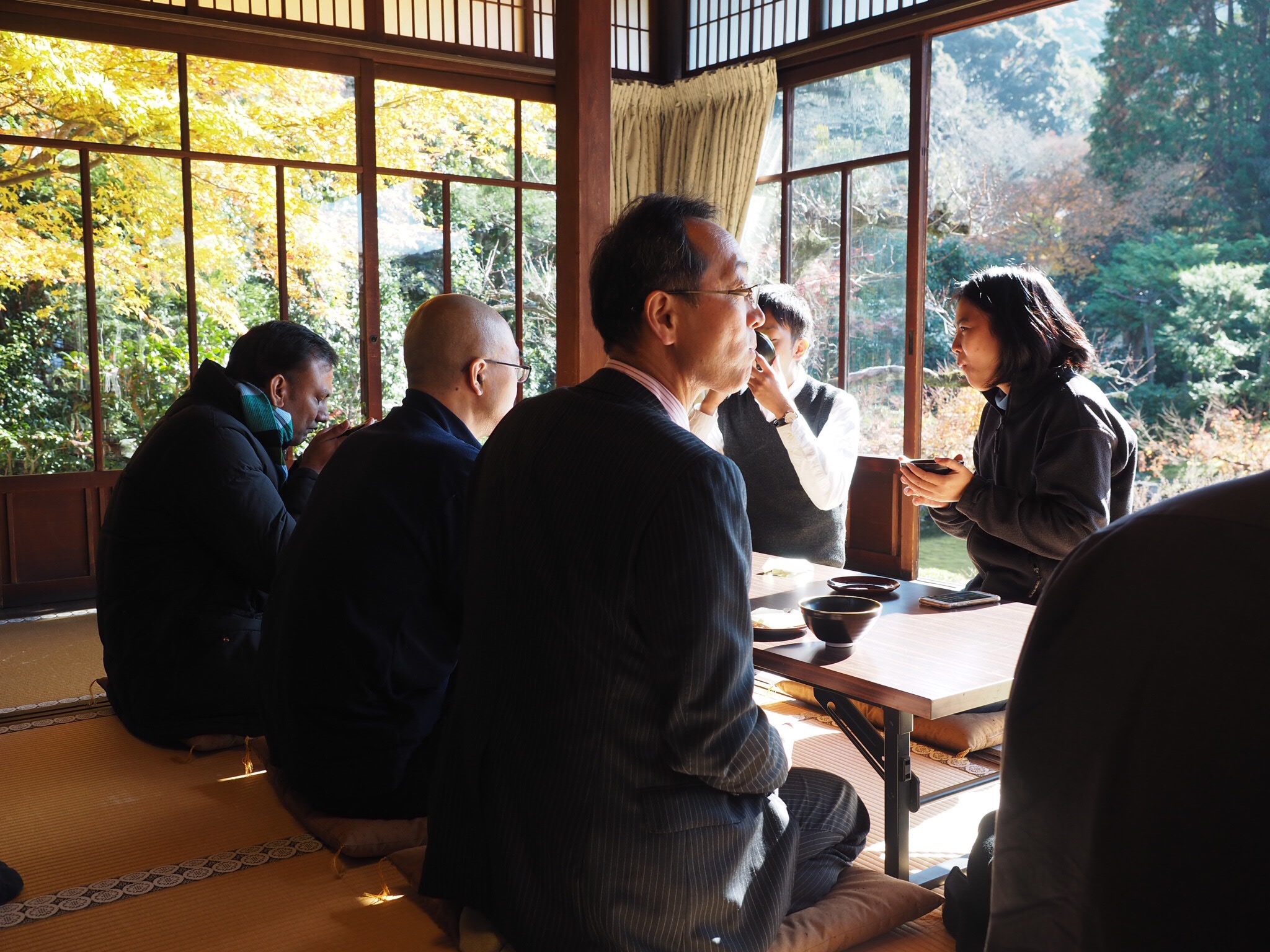 Seharusnya ada persiapan sejak teh yang masih berbentuk bubuk disiram air panas hingga disajikan. Namun karena waktu agak terbatas maka teh langsung disajikan di meja panjang bagi seluruh anggota rombongan. Japanese green tea atau yang lebih dikenal dengan matcha yang rasanya agak pahit disajikan dengan sepotong kue manis yang di dalamnya berisi kacang merah. Apalagi dinikmati dengan pemandangan taman yang indah berhiaskan momiji berwarna merah kecoklatan. Nikmat banget. Etapi sayangnya gak bisa lama-lama hahahaha. Sebenarnya yang penting bukan hanya minum tehnya, tetapi keseluruhan prosesnya termasuk estetika penyajiannya.