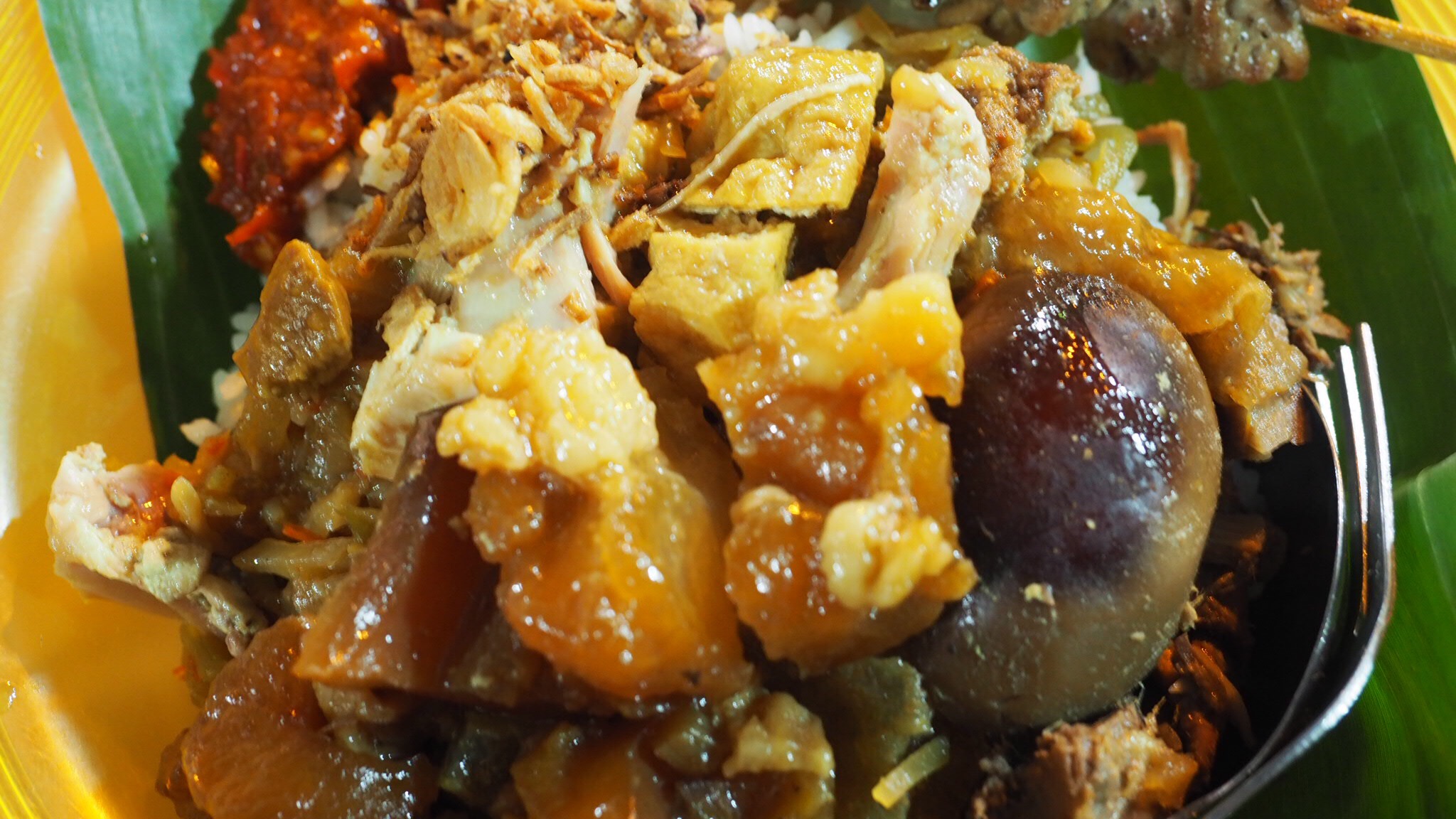 Gue pesen Nasi Gudeg Koyor. Semacam nasi gudeg dengan tambahan semur urat sapi. Rasanya gurih, beda dengan gudeg biasanya yang cenderung manis. Ngeliat isinya kayaknya sih gak sehat, tapi enaaak hahaha.