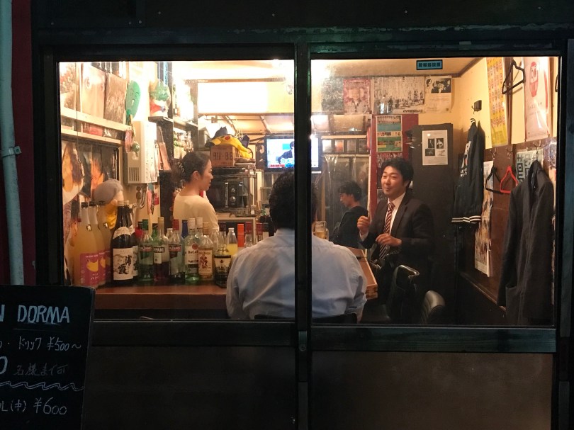 Jangan bayangin bar yang fancy dan mewah. Bar-bar di Golden Gai tampak seperti kamar kos. Dengan ukuran yang kecil, bar-bar tersebut cuma menyediakan 5-8 kursi. Itupun duduknya mepet-mepet. Tapi hampir semua bar terisi dengan pengunjung dan mereka terlihat begitu menikmati minuman mereka lengkap dengan obrolan ringan. Yes, karena pengunjung cuma sedikit dan duduknya saling berdekatan, pengunjung bar tersebut jadi ngobrol satu sama lain, juga dengan pemiliknya/bartendernya.