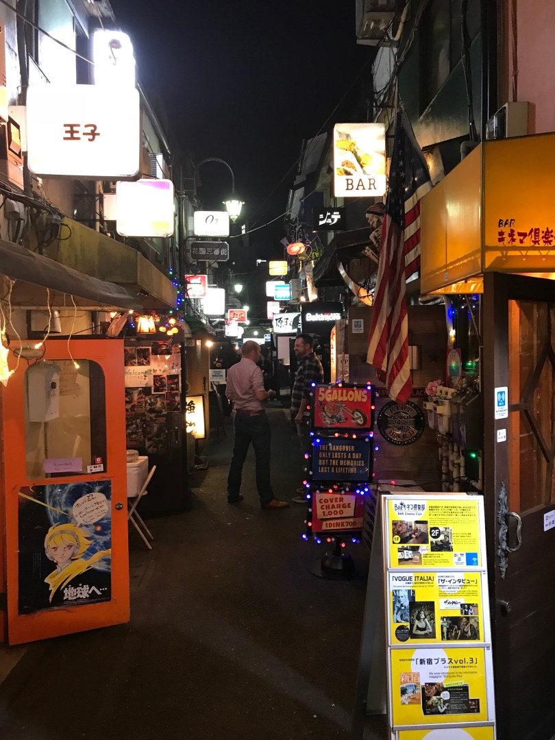 Golden Gai adalah suatu kawasan yang berbeda 180 derajat dengan hingar bingar Shinjuku di malam hari. Memasuki kawasan ini seperti memasuki dunia yang berbeda. Di Golden Gai ini terdapat banyak gang-gang sempit dengan lebar gang kira-kira 1,5 meter yang dipenuhi oleh bar di kanan kiri jalan.
