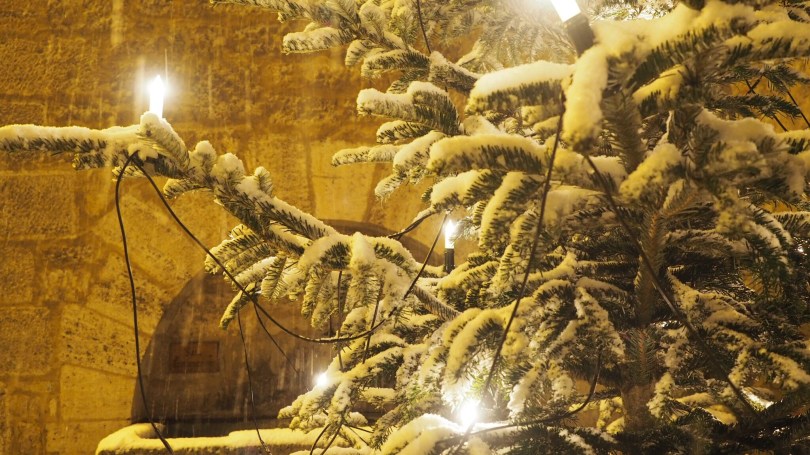 Sekitar jam 7 malam, gue terbangun. Karena badan masih terasa capek banget, jadi gue berencana skip makan malam dan nerusin tidur aja, toh masih ada satu malam lagi buat nikmati suasana malam di kota. Eh salah satu temen kelaparan dan ngajak keluar. Sebelum keluar kamar gue iseng nengok keluar jendela lhaaaa jalanan udah putih aja gitu ketutup ujan salju yang gede banget. Capek, ngantuk, (kecuali laper) langsung hilang. Langsung pake long john, kaos, sweater, kupluk, syal dan jaket tebel terus buru-buru keluar. Berdiri di bawah hujan salju yang tebal di samping pohon cemara berhiaskan lampu Natal dan sayup-sayup terdengar terdengar lagu Natal dari restoran di pinggir jalan, I finally got my first White Christmas! Mau nangis rasanya.