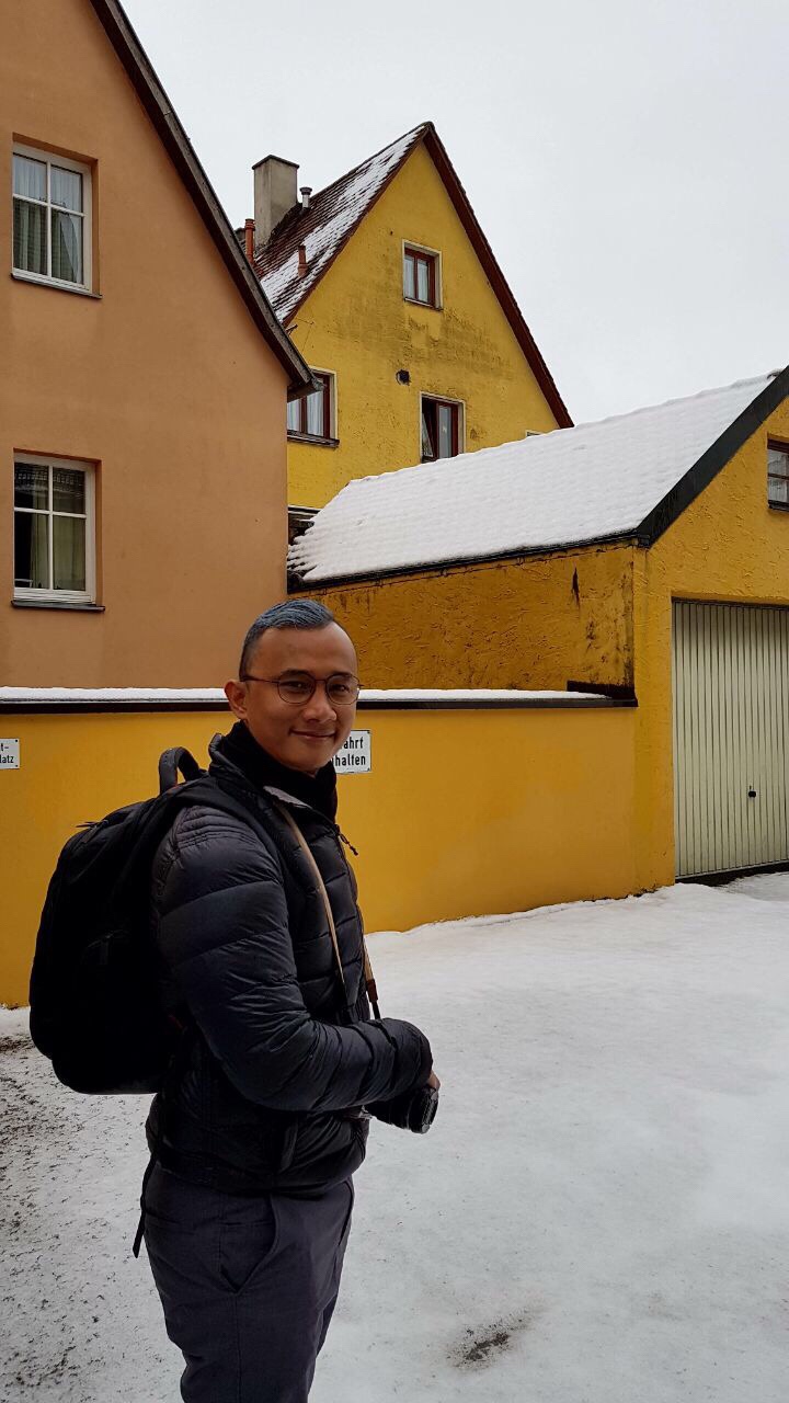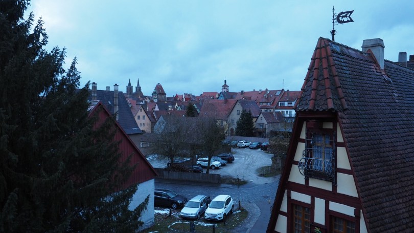 Walaupun waktu sudah menunjukkan pukul 9 lewat, tapi langit di Rothenburg masih agak gelap. Hari ini di sini matahari baru terbit jam 8.30 dan langit terlihat sedikit mendung. Angin yang bertiup terasa dingin menusuk tulang walaupun suhunya masih berkisar 4-5 derajat Celcius pagi itu.