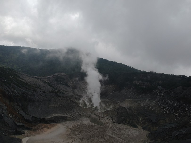Keesokan paginya sebelum pulang ke Jakarta, kami menyempatkan diri mampir ke Gunung Tangkuban Perahu, karena si birthday boy (iya, gue 😂) belum pernah ke sana. Kebetulan Sabtu pagi jalanan ke arah Lembang gak terlalu macet. Namun ternyata di lokasi sudah penuh dengan pengunjung. Konon dulu pengunjung boleh turun ke area kawah tertentu, tapi sejak terjadi letusan-letusan terakhir, jalan turun ke kawah ditutup untuk umum. Jadi kami hanya bisa berjalan-jalan di sepanjang tepi kawah bagian atas. Oya, ada pengalaman yang cukup mengganggu di sini. Kebetulan gue bawa drone kecil. Kurang lebih 5 menit setelah diterbangkan, ada beberapa orang yang mendatangi dan mengatakan bahwa pengambilan foto menggunakan drone harus meminta ijin lebih dulu (dan membayar tentunya 😝). Gue diminta menurunkan drone dan membayar. Gue bilang gak ada aturan resmi yang dipasang jadi gue akan turunkan drone tapi gue gak akan bayar. Dan mereka nurut karena memang gak ada aturan resminya hehehe.