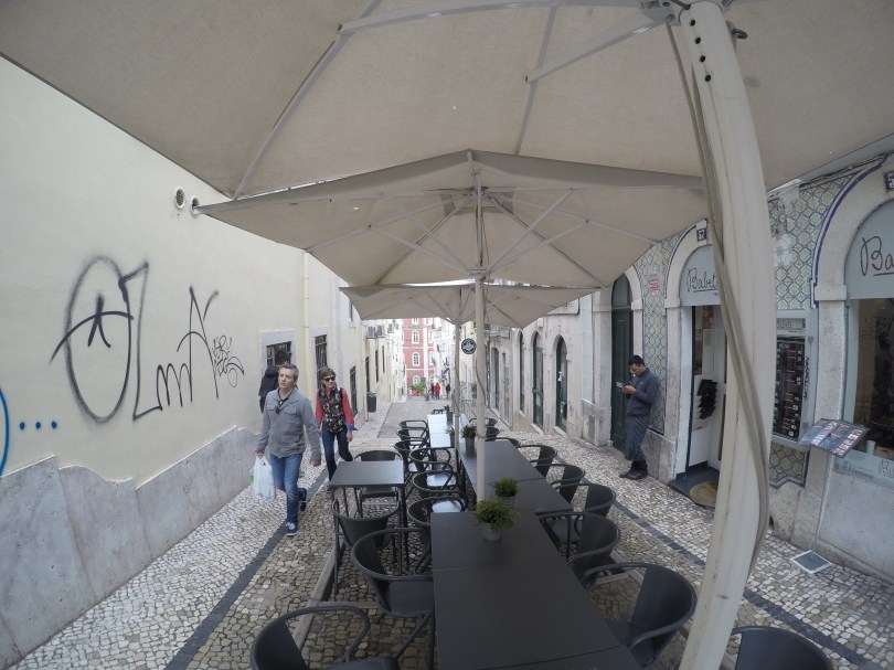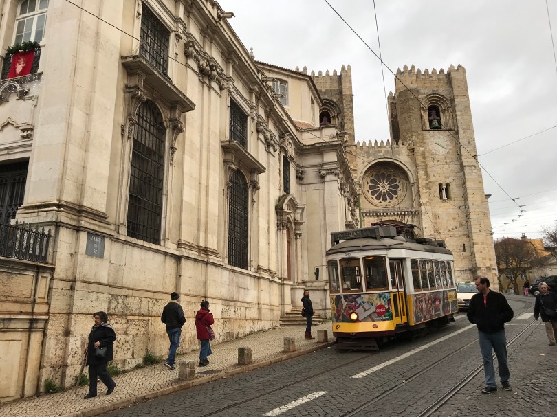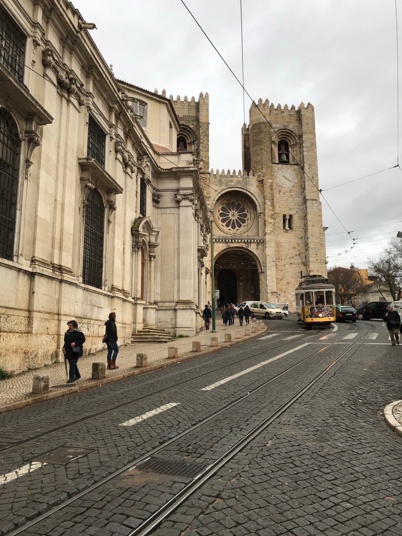 Walaupun di hari pertama saya sudah mengunjungi Lisbon Cathedral, tapi hari ini saya ingin melihatnya di siang hari. Saat menuju ke gereja tersebut, saya melewati distrik Alfama yang merupakan distrik tertua di Lisbon. Distrik ini terlihat menawan dengan rumah-rumah tua, toko-toko kecil di gang sempit, dan tentu saja coffee shop yang tersebar hampir di seluruh distrik. Jalannya yang lebih mirip gang dengan struktur yang turun naik membuat perjalanan melewati distrik ini sungguh menyenangkan hingga saya tiba di Lisbon Cathedral. Di siang hari, gereja ini terlihat sungguh megah. Pemandangan dari depan gereja juga sungguh khas saat trem melintas di depan gereja.