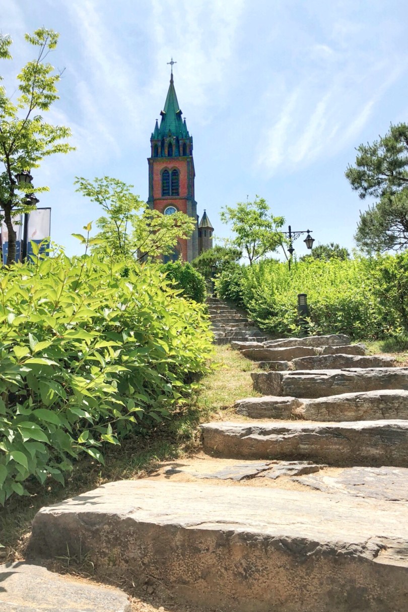 Kali ini saya mengambil arah yang berbeda dengan saat pertama kali ke Myeong Dong. Sebelum berbelanja saya mampir dulu di Myeong Dong Cathedral, sebuah gereja Katolik berarsitektur Gothic dan berusia 120 tahun. Tahun 1977 pemerintah telah menetapkan gereja ini sebagai salah satu situs sejarah di Korea Selatan.