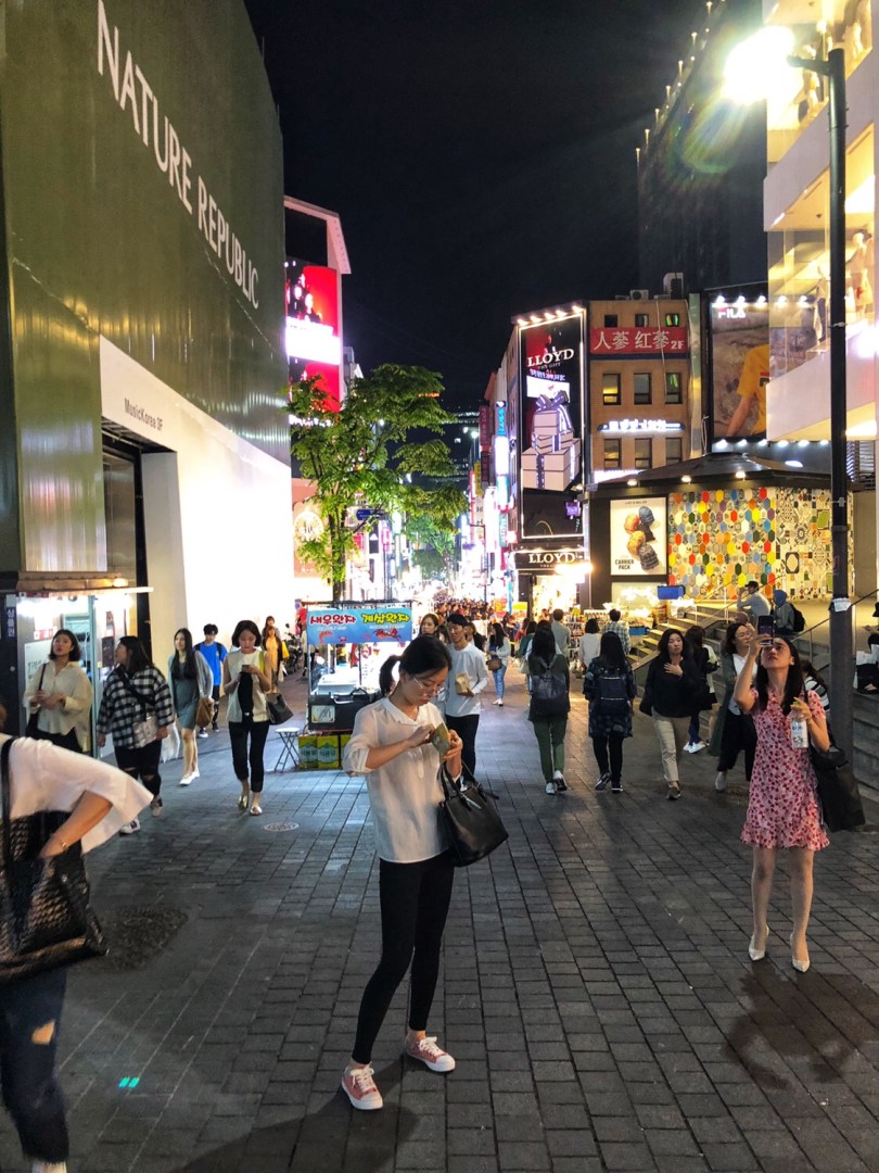 Karena masih sore, maka setelah check-in, saya dan teman-teman langsung keluar lagi. Ke mana? Myeong Dong! Hahaha. Tempat ini sangat terkenal dengan kompleks pertokoan yang ramai dengan turis dan menjadi salah satu tempat tujuan berbelanja kosmetik dan skin care. Saya belanja kosmetik? Tentu saja, karena sebelum berangkat saja sudah banyak titipan dari Indonesia hahaha. Cara merek menjual produk juga sangat menarik. Ada yang pasang display sampai ke tengah jalan, ada yang sambil teriak-teriak, ada yang memberikan bonus sampel yang banyak banget dan ada yang menawarkan untuk mencoba produknya di depan toko hahaha.