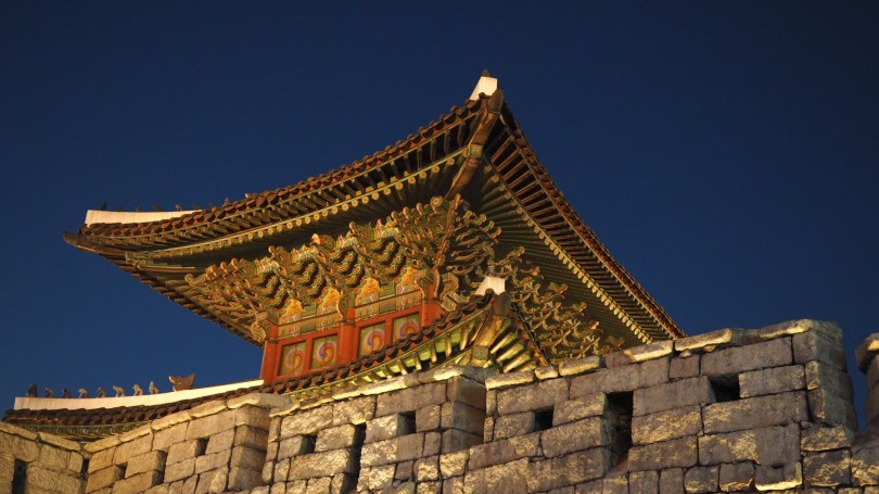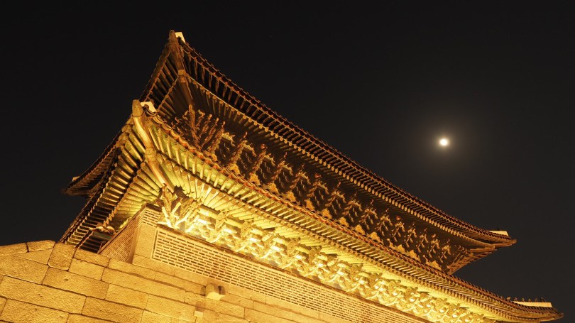 Sebelum kembali ke hotel, saya menyempatkan diri melewati Heunginjimun atau Dongdaemun, yang berarti Gerbang Besar Timur. Tadinya ada Gerbang Selatan dan Gerbang Barat, tapi keduanya sudah hancur dan tinggal tersisa Heunginjimun ini. Bangunan bersejarah ini terlihat menawan di malam hari dengan lampu sorot yang membuatnya ‘menyala’ di tengah suasana modern kota Seoul.