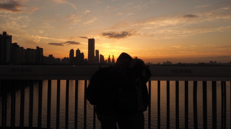 Setelah kembali ke Seoul saya melanjutkan keliling kota dan menjelang sore menuju Han Gang Bridge untuk menikmati matahari terbenam (lagi). Di sini kita bisa merasa ada di dunia berbeda. Matahari musim panas yang perlahan-lahan tenggelam serasa mengobati segala kelelahan setelah berjalan jauh hari ini. Coba lihat saja di foto-foto ini.