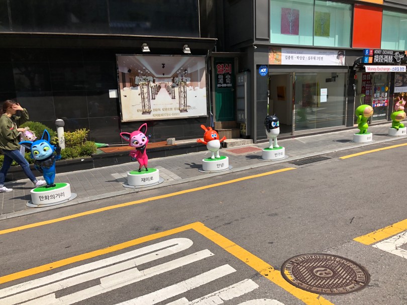 Setelah berbelanja, saya sempat berkeliling sebentar dan menemukan sebuah jalan yang penuh dengan patung-patung tokoh anime di kiri kanan jalan. Lucu-lucu banget.